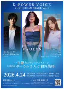 音楽 販売中 K-POWER VOICE/YURI DREAM STAGE vol.1 ヒョリン(元SISTAR)/チャンミン2AM/ミュン 開催日時4月24日(金)14:00開演(13:00開場)、18:30開演(17:30開場)開催場所福岡市民ホール 大ホール 詳細はこちら