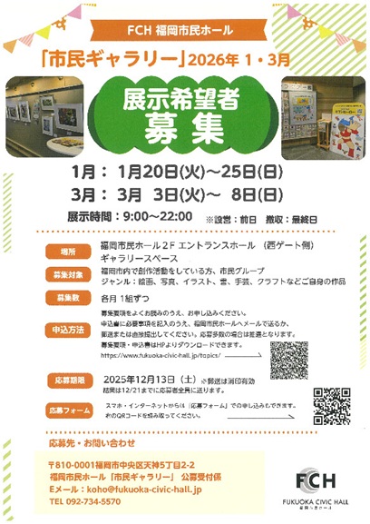 Email:koho@fukuoka-civic-hall.jp (※件名に「市民ギャラリー」公募としてください)