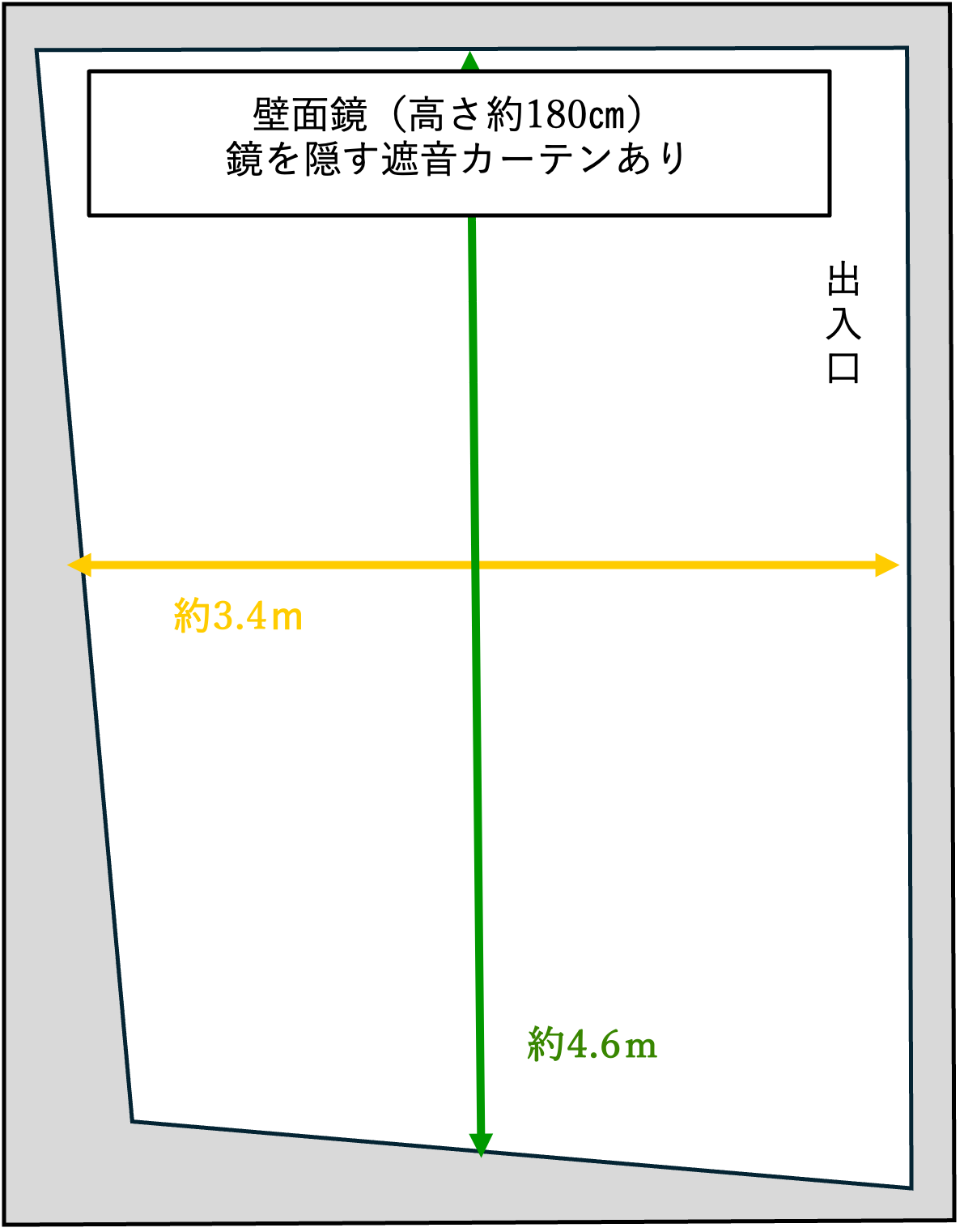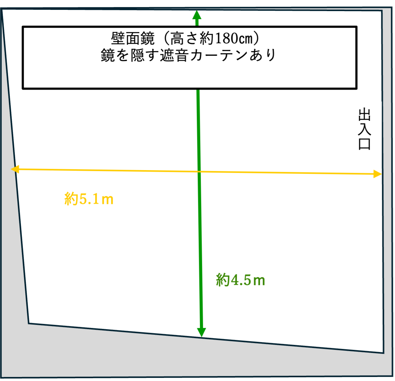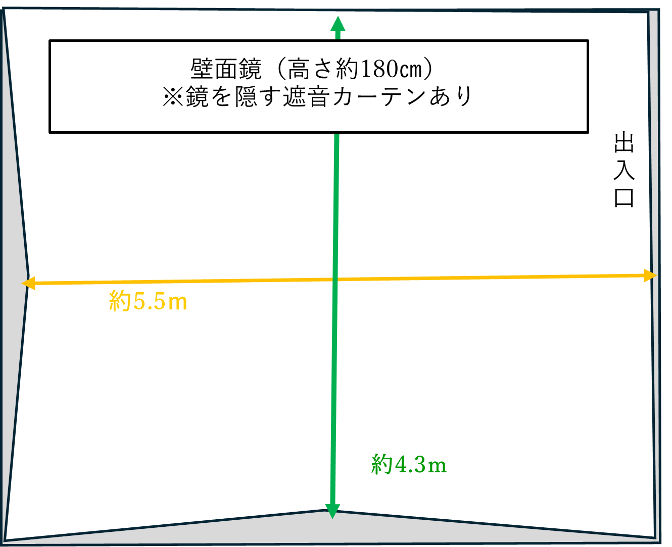 設備:壁面鏡あり(一面)、鏡面に遮音カーテン、フローリング、コンセント