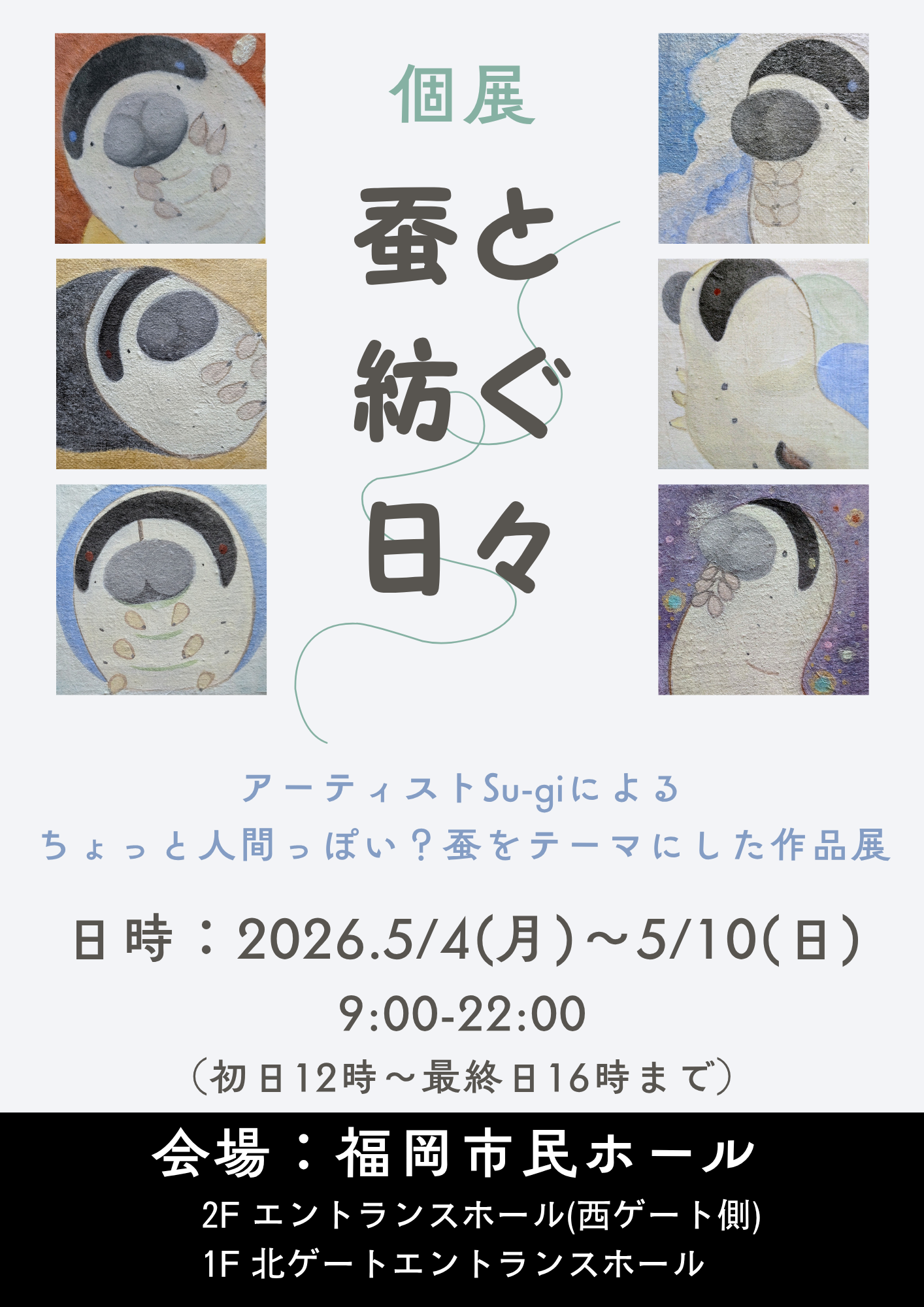 作家Su-gi(スギ)さんによる、ちょっと人間っぽい仕草や表情の蚕の幼虫たちをテーマに